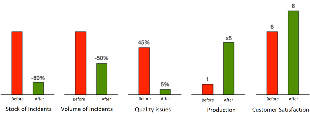 Thanks to this approach, the team managed to reduce the stock of incidents by 80% and the volume of new incidents by 50% in 2 months. The non-quality of the corrective measures, i.e. the fact of having to go through the process several times to resolve an incident, fell from 45% to 5%. The number of implementations in production was multiplied by 5. Customer satisfaction has gradually increased from a score of 6/10 to 8/10.